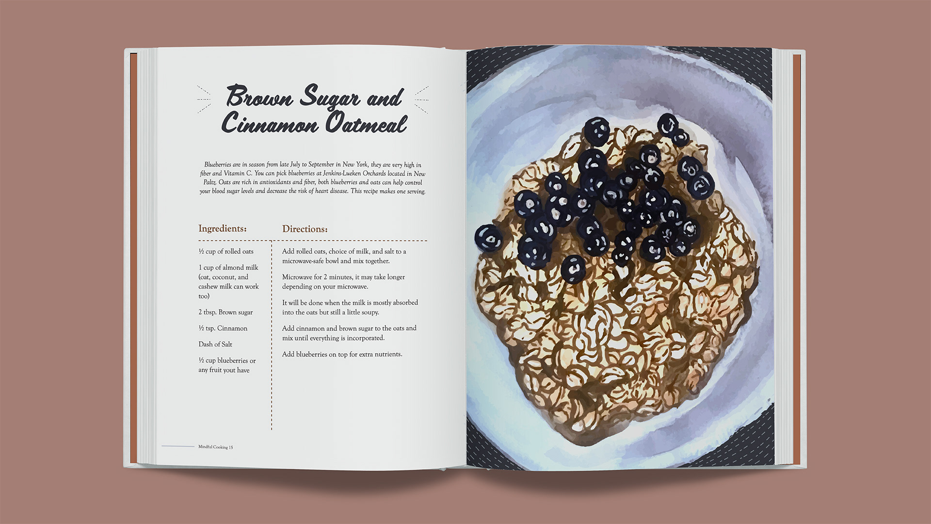College students and young adults living on their own for the first time tend to struggle with cooking and making smart food choices. What we consume affects not only our bodies but our environment. Young adults living in and around New Paltz have ample opportunities to eat healthily and sustainably, yet those who are first entering the world of cooking may not be fully aware of these options. Mindful Cooking aims to educate these first-timers on sustainable and healthy food options, helping them find locally grown produce in and around New Paltz, and encouraging them to incorporate healthy recipes into their everyday lives. The cookbook includes original illustrations and easy-to-follow recipes as well as resources on local farms and farmers’ markets. Mindful Cooking gives the reader the right tools to make sustainable and healthy cooking a habit, and not just a thought. Being aware of your food choices is the first step to mindful eating and cooking.